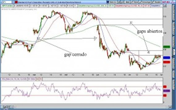 A los dos gaps down que tiene para cerrar más arriba y que venimos siguiendo desde hace tiempo se le sumaron dos nuevos gaps down producidos esta semana. Recordemos que todos los gap down se cierran subiendo y los gap up bajando. Los precios de $108 (cierre del primer gap) y $110 (cierre del segundo) son los targuet para las últimas 7 ruedas de Agosto, parece difícil que el SPY siga cayendo y acumulando gaps abiertos sin cerrar.
